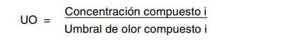 La carga odorífera en un ambiente puede determinarse a través del umbral de olor de los COV determinados cuantitativamente. La división de la concentración de un compuesto concreto por su umbral de olor mostrará las unidades de olor (UO), es decir, las veces que ese compuesto supera su umbral de olor. Adicionando todas las unidades de olor del aire interior estudiado se obtendrá la carga odorífera del medio. No todos los compuestos químicos tienen publicado su umbral de olor, en cuyo caso, no se podrá determinar la contribución odorífera del compuesto al total de las UO.