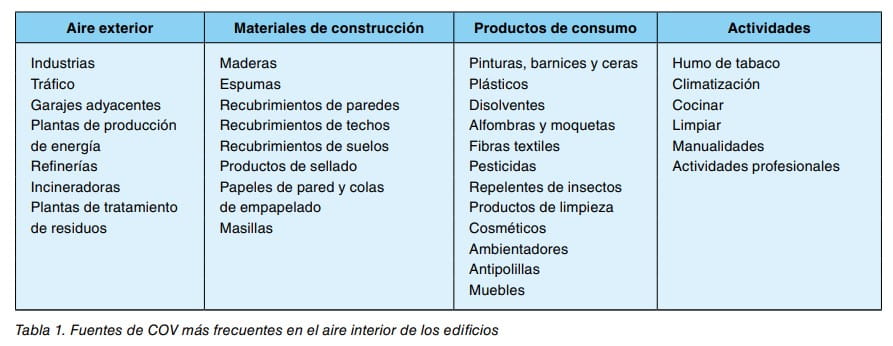 Los materiales de construcción (pinturas, adhesivos, placas de techo, recubrimientos de suelos), muebles y decoración de un edificio pueden emitir COV. En función de las características físicas del material y del modo de aplicación, es posible diferenciar entre emisiones procedentes de productos húmedos (pinturas, disolventes, barnices, masillas, etc.), productos secos (madera, textiles, recubrimientos para suelos, etc.), materiales captadores (madera, papel, textiles) y productos de mantenimiento del edificio (materiales de conservación, productos de limpieza). (Véase NTP 521). Un porcentaje importante de las quejas, relacionadas con la baja calidad del aire interior y con los olores, están correlacionadas con nuevas edificaciones o con el uso de materiales de construcción debido a reformas. Generalmente, las concentraciones de COV vinculadas a los materiales de construcción disminuyen de forma relevante con el tiempo transcurrido desde la realización y/o reforma de los edificios. Generalmente, las concentraciones de COV vinculadas a los materiales de construcción disminuyen de forma relevante con el tiempo transcurrido desde la realización y/o reforma de los edificios.