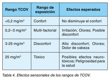 No hay un método estandarizado para determinar la concentración total de COV (TCOV) en un ambiente interior. Sin embargo, la Comisión Europea y el estándar internacional ISO 16000-6 presentan dos metodologías a seguir. En la tabla 3 se presentan los COV que la Comisión Europea recomienda cuantificar como mínimo para la evaluación del TCOV. Por otra parte, la norma ISO 16000-6 no incluye en su evaluación del TCOV los COV más volátiles (0°C < Punto de ebullición <50°C). En último lugar, es recomendable cuantificar individualmente, aparte de los compuestos mencionados en la tabla 3, todos los COV que presenten características tóxicas, irritantes y/o umbrales de olor muy bajos. El resto de los compuestos detectados deben cuantificarse con el factor de respuesta del tolueno. Para valorar el efecto sensorial de las concentraciones de TCOV obtenidas suelen utilizarse los valores indicativos presentados en la tabla 4.