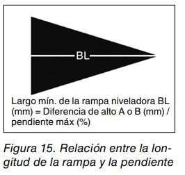 La longitud de la rampa niveladora ha de ser tal que se cumpla la relación entre desnivel y pendiente máxima (figura 15).