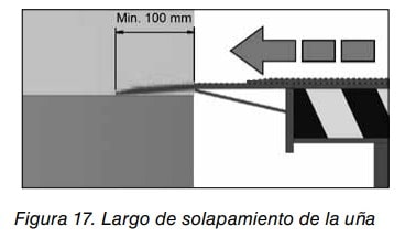 La norma UNE-EN 1398 contempla un largo de solapamiento mínimo de la uña de una rampa niveladora de 100 mm. En consecuencia la longitud de la uña ha de ser tal que permita garantizarlo (figura 17).