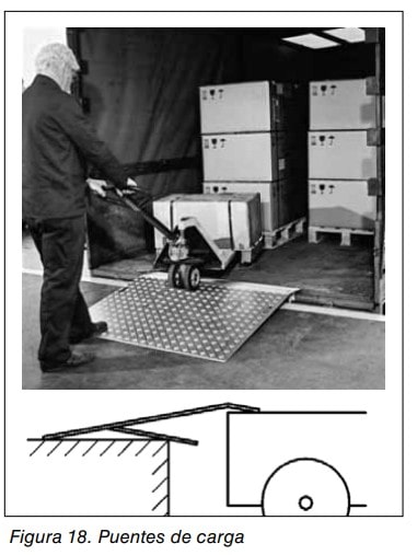 Son tablas de carga de estructura rígida que salvan pequeñas distancias y desniveles entre el muelle y la plataforma del vehículo. Son especialmente aptas para muelles de carga en los que la frecuencia de carga y descarga es muy baja, o como solución flexible de apoyo puntual a una rampa niveladora de mayores prestaciones. Su capacidad está limitada para soportar el paso de pequeñas cargas. También conocidas como pasarelas transportables, puesto que no requieren de instalación (figura 18).