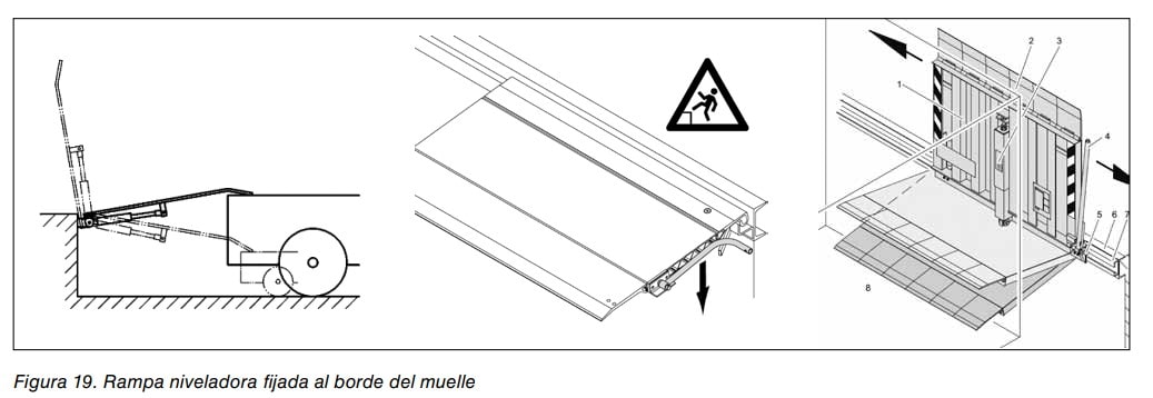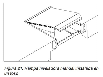 La rampa niveladora manual, se aloja en un foso practicado en el muelle de carga de forma que en posición de reposo queda integrada en el muelle de carga (figura 21).