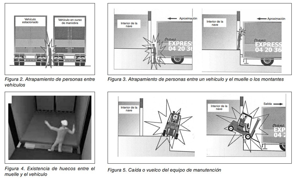 El movimiento de mercancías entre los vehículos de carga y los almacenes de las empresas se realiza preferentemente mediante los muelles de carga y descarga para ajustar las diferencias de altura existentes entre los almacenes y el nivel de la caja de carga del vehículo. En estas operaciones, los operarios de los muelles y los conductores de los vehículos de carga y de transporte pueden verse sometidos a riesgos de diverso origen y gravedad.