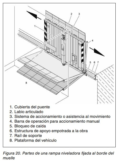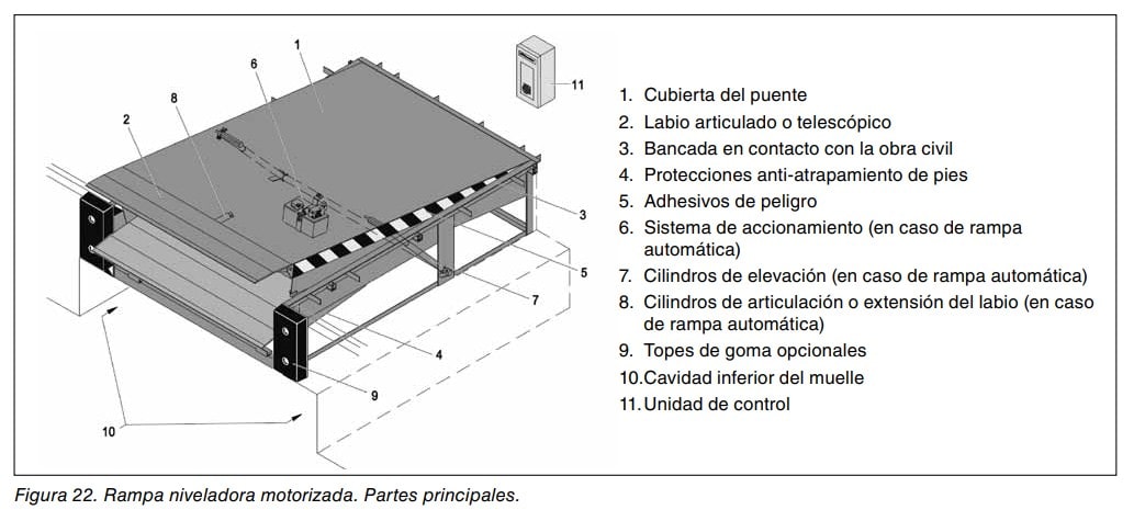 - Rampa niveladora: Dispositivo fijo o móvil destinado para cubrir el espacio entre un muelle de carga o zonas similares de carga y la superficie de carga de un vehículo que puede estar a diferentes niveles. Habitualmente está formada por una plataforma abisagrada en su extremo posterior y que se eleva mediante un sistema mecánico (normalmente hidráulico) hasta la altura de la caja del camión. En el extremo anterior dispone de un labio articulado o telescópico que se apoya sobre el suelo de la caja del vehículo.