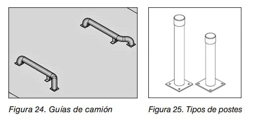 Las guías para camión permiten situar convenientemente el camión al centro del abrigo del muelle. Deben ser de una longitud aproximada mínima de 2,40 m y de una altura de 0,30 m. Deben estar situadas a cada lado de los pasillos de cada puerta del muelle, su diseño debe ser redondeado sin aristas que puedan dañar las ruedas de los camiones. Deben estar complementadas con una señalización horizontal amarilla de unos quince metros antes de las guías (figura 24).