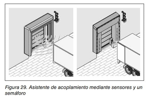 Los asistentes de acoplamiento son sensores de presen cia situados en la hoja de la puerta o en los topes com binados con luces de señalización de forma que resulta más cómodo y seguro acercarse a la estación de carga y descarga. Al maniobrar el conductor puede deducir la distancia al lugar de acoplamiento en función del color del semáforo. El semáforo en rojo le indica que ha alcanzado la posición de acoplamiento óptima y que debe detenerse. (figura 29).