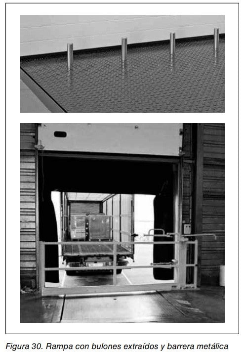 En aquellas instalaciones en las que se trabaje con las puertas de las estaciones de carga abiertas cuando no dispongan de vehículos atracados, es necesario disponer de un sistema que evite que el conductor del vehículo de manutención se caiga accidentalmente, por ejemplo, unos bulones macizos integrados en la rampa niveladora que se extraen automáticamente cuando la rampa niveladora se encuentra en la posición de reposo. Otro sistema equivalente es una barrera metálica que impida la salida (figura 30).