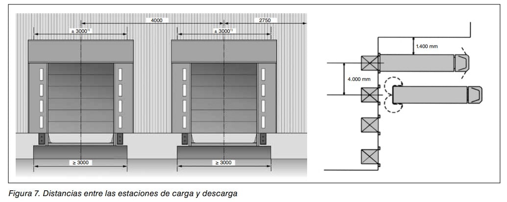La puerta de carga y descarga debería tener una anchura entre 2500 a 3000 mm. y una altura entre 3000 a 3600 mm. , dependiendo de las necesidades. Hay que tener en cuenta las medidas del abrigo de muelle (figura 7).