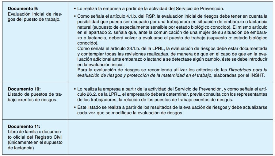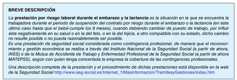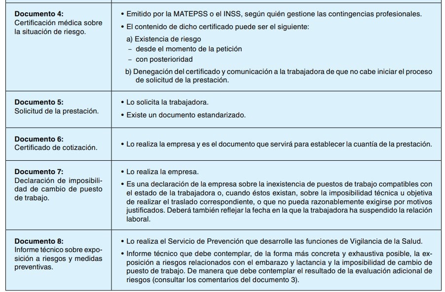 En la NTP 992 se propone un procedimiento de empresa para la gestión del riesgo durante el embarazo y la lactancia. Una de las fases debe ser la gestión de la prestación durante el embarazo y la lactancia cuando fuese necesaria. Su solicitud debe realizarla la trabajadora afectada y es necesario que obtenga el apoyo por parte de la empresa en su gestión. En la propuesta de procedimiento de la NTP 992 se contempla que se determine qué departamento y personas tienen la función de prestar apoyo a la trabajadora y, generalmente, serán quienes tengan la función de gestionar los recursos de las empresas.