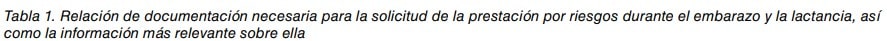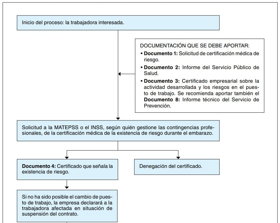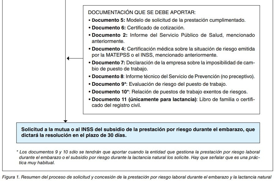 En la figura 1 se presenta un resumen de los principales pasos del proceso de solicitud y concesión de la prestación por riesgo durante el embarazo y la lactancia natural, así como los documentos necesarios para la complementación de cada una de las fases.