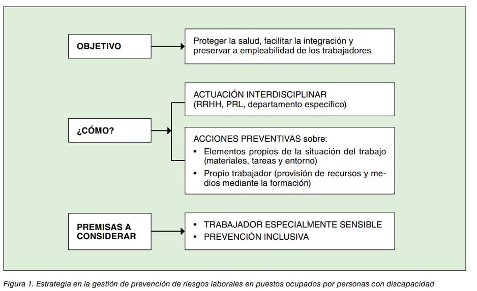 Las estrategias para la gestión de la prevención de riesgos en puestos ocupados por personas con discapacidad (ver resumen en la figura 1) deben tener como objetivo común, no sólo proteger la salud, sino también facilitar la integración y preservar la empleabilidad de los trabajadores.