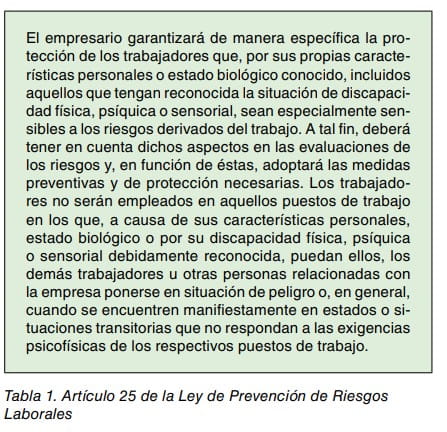 Uno de los puntos de partida debe ser la consideración de trabajador especialmente sensible especificada en el Artículo 25 de la Ley de Prevención de Riesgos Laborales (ver tabla 1).