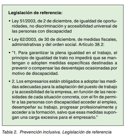 Se considera prevención inclusiva (ver legislación relacionada en la tabla 2) el conjunto de actividades o medidas adoptadas o previstas en todas las fases de actividad de la empresa con el fin de evitar o disminuir los riesgos derivados del trabajo, incluyendo criterios que engloben trabajadores especialmente sensibles, así como de accesibilidad global del entorno.