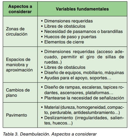 Se debe garantizar que se tiene posibilidad de acceso al lugar de trabajo y el desplazamiento en el mismo, procurando la mayor independencia posible y previendo las necesidades en la fase de diseño. Los espacios de trabajo y las zonas de paso deben diseñarse a partir de itinerarios que permitan el desplazamiento. Los aspectos que deben contemplarse (ver tabla 3) son las áreas de trabajo, zonas de circulación, espacio de maniobra, zonas de descanso, cambios de plano y pavimentos.
