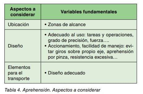 El trabajo implica la utilización de máquinas, herramientas o equipos a través de diversas acciones (manipular, coger, asir, pulsar, agarrar…). Para que éstos sean manejables para todos deben cumplir unos criterios (ver tabla 4) referidos a las distancias en que se sitúan, al uso para que se han concebido y teniendo en cuenta no sólo su utilización, sino también su transporte.