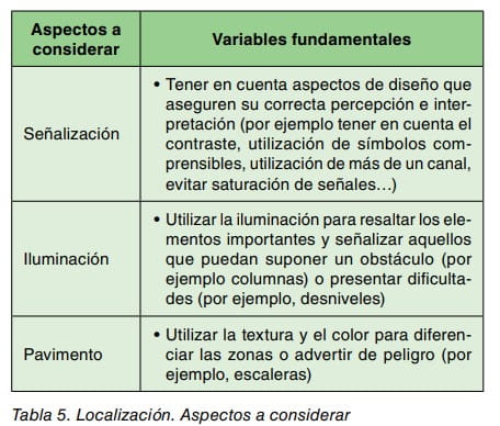 Se trata de facilitar información referida tanto a elementos, (componentes, piezas) concretos de manera que puedan identificarse y diferenciarse, pero también se refiere al diseño de espacios y zonas de paso a fin de que puedan ser ubicados correctamente (ver tabla 5).