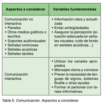 La norma UNE 170001 distingue entre medios para la comunicación no interactiva e interactiva. En el primer caso la persona es receptora de la información y se refiere a los dispositivos que informan de una situación (por ejemplo una señal de emergencia) o del estado de una máquina o proceso. En el segundo caso la persona también transmite información, como por ejemplo en la utilización de ordenadores o en la comunicación interpersonal (ver tabla 6).