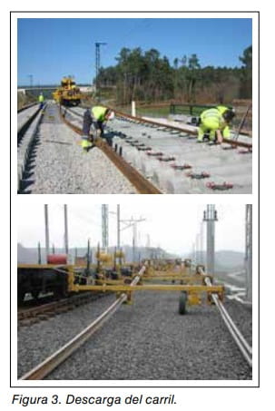 - e) Descarga del carril. La descarga del carril se realiza mediante diferentes métodos en función de si se trata de barras cortas (12, 8 m, etc.) o barras largas soldadas (144, 270 m, etc.) y del tipo de carril (45, 54 o 60 Kg/ml). En el caso de barras largas se emplea un tren de descarga de carril con el apoyo de un pórtico viga o similar. Ver figura 3.
