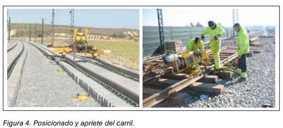 - f) Montaje del carril sobre la traviesa (mediante vía auxiliar o sin vía auxiliar). La colocación del carril sobre la traviesa es realizada mediante el empleo de una posicionadora de carril. Posteriormente es necesario realizar el apriete entre el carril y la traviesa mediante moto clavadoras. Ver figura 4.