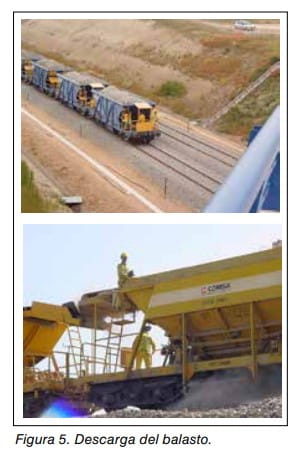 - g) Descarga del balasto. Esta operación es realizada utilizando trenes con tolvas sobre los que se carga el balasto en la zona de acopio mediante palas cargadoras y que posteriormente se desplazan a la zona de trabajos para la descarga del mismo sobre la vía. Ver figura 5.