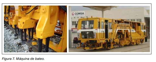 - j) Nivelación y alineación. La maquinaria necesaria para esta operación es la bateadora de línea y/o de desvíos. Las operaciones de nivelación y alineación se realizan con el fin de conseguir que la vía definitiva disponga de una geometría correcta en cuanto a la cota y la posición en planta apoyándose en los datos proporcionados por el estudio topográfico y que son utilizados por la bateadora para implementar en las sucesivas operaciones de levante y nivelación de la vía. Ver figura 7.