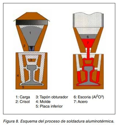 - l) Soldadura y liberación de tensiones. Previamente a la soldadura es necesario realizar operaciones de ajuste y corte de carril para obtener una superficie adecuada de unión. Estas operaciones son realizadas con maquinaria de corte manual (tronzadora). Asimismo es necesario precalentar los carriles mediante la utilización de equipos oxiacetilénicos. Las barras largas se sueldan mediante soldadura aluminotérmica o eléctrica. La soldadura aluminotérmica consiste en la aportación de acero fundido, obtenido a partir de la reacción exotérmica, dentro de un crisol, de óxido de hierro con aluminio.Ver figuras 8 y 9. Al mismo tiempo que se van realizando las soldadu ras se puede llevar a cabo la liberación de tensiones, operación que consiste en fijar la barra a las traviesas después de darle la longitud correspondiente a la tem peratura de liberación.