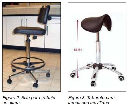 Los taburetes han de ser regulables, de material lava ble y, si son para trabajo en altura, por ejemplo, en las poyatas, tienen que tener reposapiés. (Fig.2). Para las tareas en las que se requiera una movilidad alta, hay que usar taburetes bajos. (Fig.3).