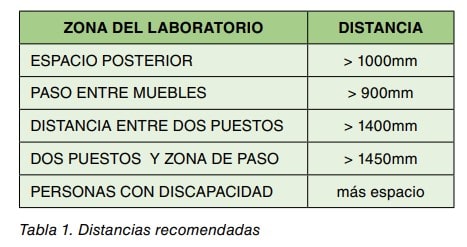 La normativa actual referente al diseño en los laboratorios se centra, principalmente, en los requisitos de seguridad y a los métodos de ensayo para mesas de laboratorio. Así mismo, una gran parte de la normativa existente va dirigida a los fabricantes e instaladores cuando hablan de las recomendaciones de mesas de laboratorios, los armarios y otros muebles similares; no obstante, tam bién proporcionan algunas recomendaciones respecto a sus dimensiones y a los espacios que se resumen a continuación: