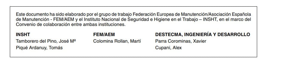 De acuerdo con el RD.1215/1997, Art. 5, el empresario de acuerdo con los Art.18 y 19 de la Ley 31/1995 de Prevención de Riesgos Laborales, debe garantizar que los trabajadores y sus representantes reciban una formación e información adecuadas sobre los riesgos derivados de la utilización de los equipos de trabajo, así como las medidas de protección y prevención. En base a ello, el equipo solo debe manejarse por personal formado en su manejo, incluyendo los procedimientos de evacuación en caso de emergencia, fallo del suministro eléctrico o de los mandos de control.