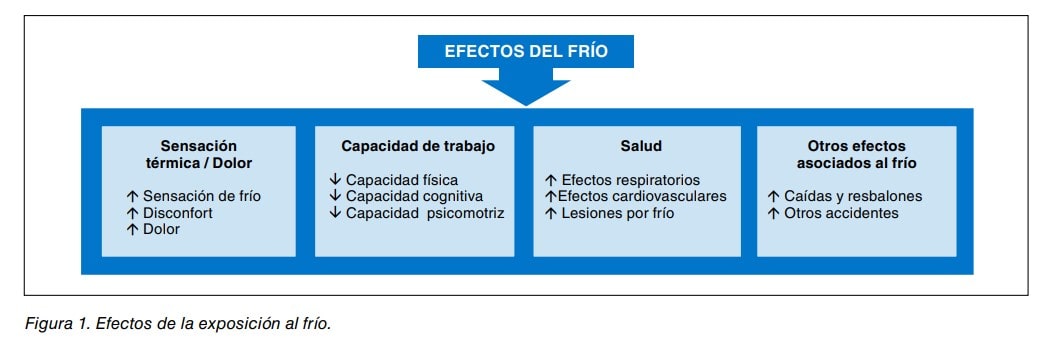 La exposición profesional al frío, natural o artificial, se puede encontrar en diversas actividades profesionales. Los principales efectos sobre la salud de una exposición directa al frío son la hipotermia y la congelación, además de riesgo de padecer trastornos musculo-esqueléticos (TME). Es difícil caracterizar un ambiente frío exclusivamente con los criterios fisiológicos, ya en función del tipo de trabajo y las características individuales, podemos tener una sensación de disconfort térmico a partir de temperaturas inferiores a 15 °C. Además, la sensación de frío no se encuentra solamente ligada a la temperatura medida, ya que puede llegar a acentuarse debido a factores como el viento (velocidad del aire) y la humedad.