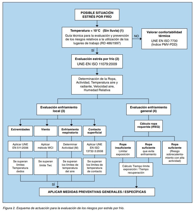 Cuando la temperatura de los lugares de trabajo es inferior a 10 °C y especialmente en trabajos que, por las características de proceso y operaciones se deben desarrollar en ambientes fríos, se recomienda la evaluación del riesgo de estrés térmico por frío.