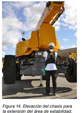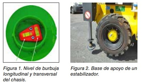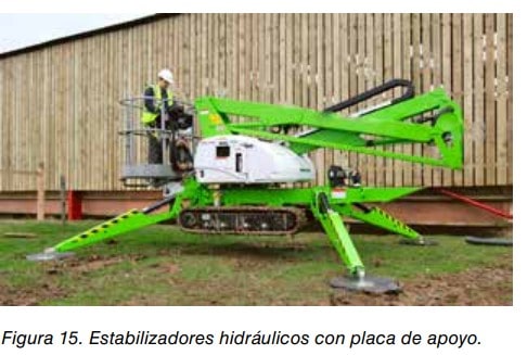Los estabilizadores sirven para mejorar la estabilidad de la PEMP o aumentar el área de estabilidad. Algunas PEMP de gran altura, disponen de cilindros hidráulicos que elevan la PEMP y ejes extensibles para aumentar la anchura y conseguir el área de estabilidad de trabajo. Ver figura 14.
