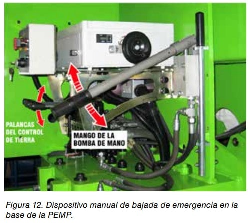 Todas las plataformas de trabajo deben estar equipadas con sistemas auxiliares manuales o con un motor auxiliar de descenso y con un sistema retráctil o de rotación en caso de fallo del sistema primario. Ver figura 12.