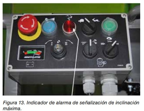 La plataforma de trabajo debe estar equipada con una alarma u otro sistema de advertencia que se active automáticamente cuando la base de la plataforma se inclina más de 5º de la inclinación máxima permitida en cualquier dirección. Ver figura 13.