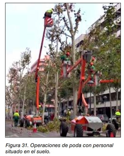 - En trabajos de poda, debe delimitarse la vertical de la zona de trabajo y situar otro operario que evite que otras personas puedan acceder a la zona de riesgo. Ver figura 31.