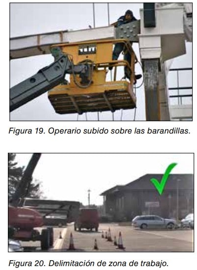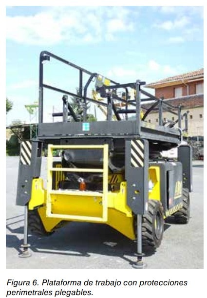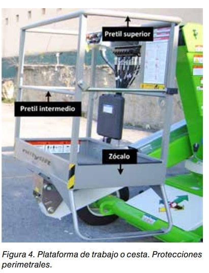 La plataforma de trabajo debe estar equipada con barandillas o cualquier otra estructura en todo su perímetro a una altura mínima de 0,90 m y disponer de una protección que impida el paso o deslizamiento por debajo de las mismas o la caída de objetos sobre personas de acuerdo con el Real Decreto 486/1997 sobre lugares de trabajo (Anexo I.A.3.3) y el Real Decreto 1215/1997 sobre equipos de trabajo (Anexo 1.1.6).