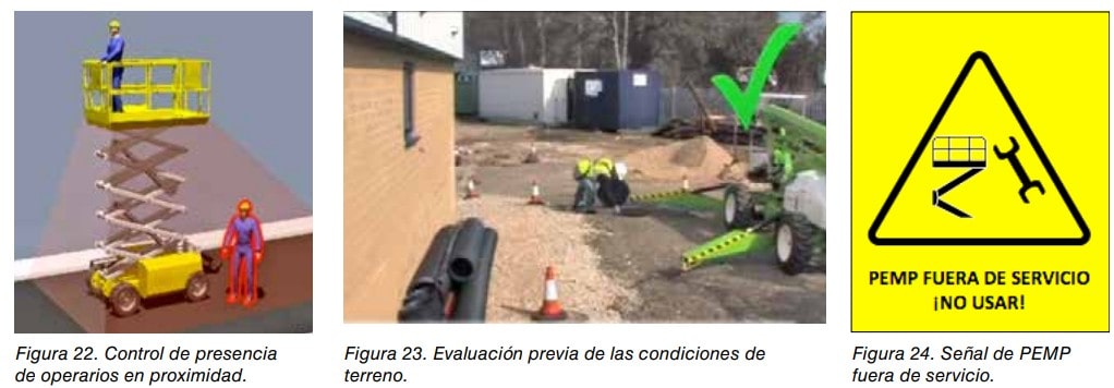 - Verificar antes de bajar o mover la PEMP, que no existen personas u obstáculos en zonas adyacentes.