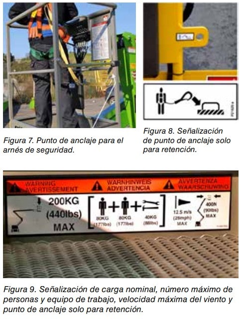 Complementariamente debe disponer de puntos de anclaje (retención) para poder anclar los arneses de seguridad para cada persona que pueda situarse sobre la plataforma de trabajo. Se puede sujetar más de un arnés a un anclaje simple, si ha sido diseñado para tal fin.