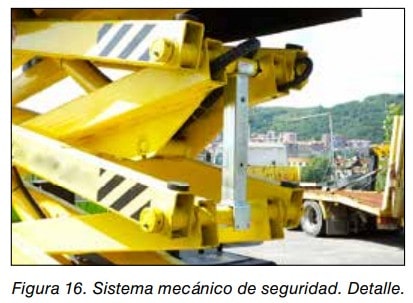 Deben estar provistos de un dispositivo de seguridad accionado por un limitador de sobrevelocidad. Este dispositivo de seguridad debe llevar progresivamente la plataforma de trabajo con la carga máxima hasta un tope y mantenerla parada, en caso de fallo del mecanismo de elevación.