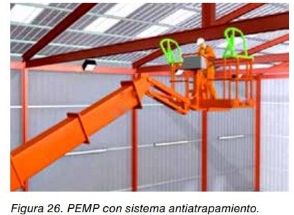 Se pueden utilizar PEMP con las protecciones perimetrales plegables siempre que no se abran hacia el exterior, cumplan con los requisitos anteriores y estén fijadas sólidamente a la plataforma con dispositivos de cierre seguros a un desbloqueo involuntario o pérdida. Ver figura 6.