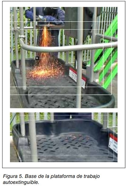 La base de la plataforma de trabajo debe estar fabricada con materiales por lo menos ininflamables, por ejemplo materiales autoextinguibles que no mantienen la llama cuando se retira la fuente ignífuga. Ver figura 5.