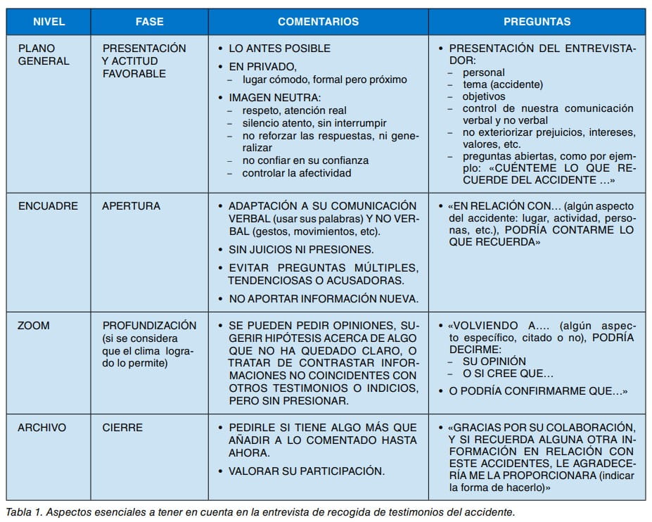 Para ayudar en ese proceso, se sintetizan en la tabla 1 algunos aspectos esenciales a tener en cuenta en la entrevista de recogida de testimonios del accidente. Vamos a considerar la entrevista como si se tratara de un reportaje fotográfico, diferenciando los cuatro niveles de actuación siguientes: