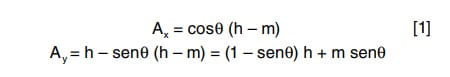 A continuación se desarrollan las expresiones para el cálculo de las coordenadas cartesianas correspondientes al alcance en posición de pie y en el plano sagital. La altura de los hombros y la altura del tercer metacarpiano se simbolizan mediante las variables h y m respectivamente. La ecuación 1 muestra el cálculo de las dos componentes cartesianas del alcance, que son función del ángulo θ de flexo-extensión del hombro.