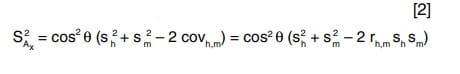 La ecuación 2 muestra el cálculo de la varianza de la componente de abscisas del alcance, donde sh y sm son las desviaciones estándar de la altura de los hombros y la altura del tercer metacarpiano, respectivamente, covhm es la covarianza entre las variables h y m, y rhm es el coeficiente de correlación de Pearson entre dichas variables. Dado que las dimensiones antropométricas del cuerpo humano no son independientes unas de otras, esta covarianza es necesaria para contemplar la correlación entre las mismas, en este caso entre h y m.