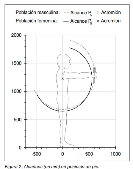 La figura 2 muestra una representación gráfica del alcance (ecuación 4) en el plano sagital y en posición de pie con los datos antropométricos (tabla 1) del percentil 5 de la población laboral masculina y del percentil 5 de la población laboral femenina. De esta forma, los objetos situados a estas distancias podrán ser alcanzados por el 95% de la población laboral masculina en un caso y el 95% de la población laboral femenina en el otro.