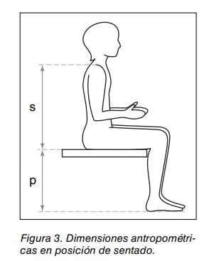 Las variables h y m son las mismas que en el caso anterior: la altura del hombro y la altura del tercer metacarpiano respectivamente. La variable s corresponde a la altura de los hombros sentado, mientras que la variable p es la longitud de la pierna (altura poplítea).