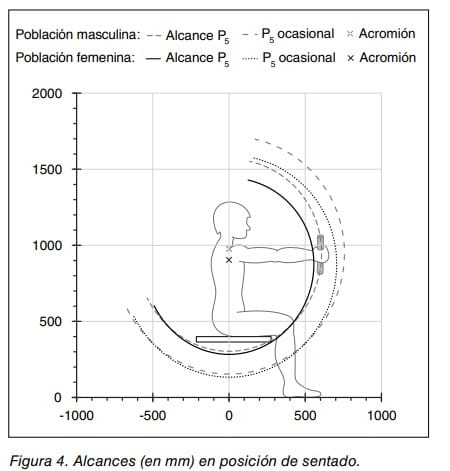 Mediante la ecuación 4, y utilizando los datos antropométricos de la tabla 1, se puede calcular el alcance en el plano sagital para cualquier percentil de la población. La figura 4 muestra estos valores para la posición de sentado y los percentiles 5 de la población masculina y femenina.