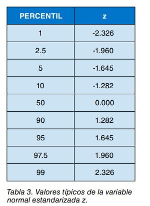 donde z es una variable normal estandarizada cuyo valor es función del percentil que se quiere calcular. En la tabla 3 se muestran algunos de los valores más habituales de z.