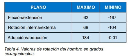 Según Greene y Hechman (1997), los ángulos de rotación del hombro en función del plano de movimiento toman los valores que se muestran en la tabla 4.